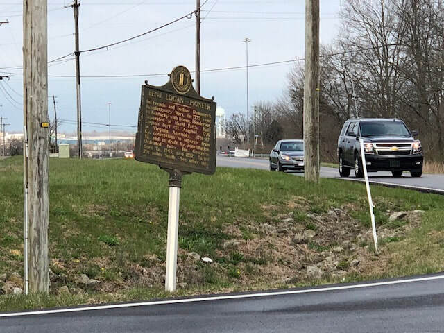 I drove by the creek one more time and looked high up on the bluff on the opposite side. Through the trees, I could just make out a monument. Looking on my phone at pictures on FindAGrave.com, I decided it looked like Benjamin Logan’s grave marker. Knox’s grave is up there too, but can’t be seen from the road.