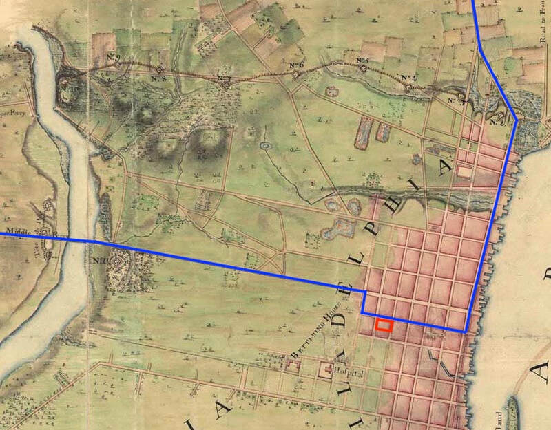 Philadelphia and the path of the parade, with Independence Hall marked in red. The exact path of the army as it exited the city at the end of Chestnut Street is uncertain. (Library of Congress Map Division)
